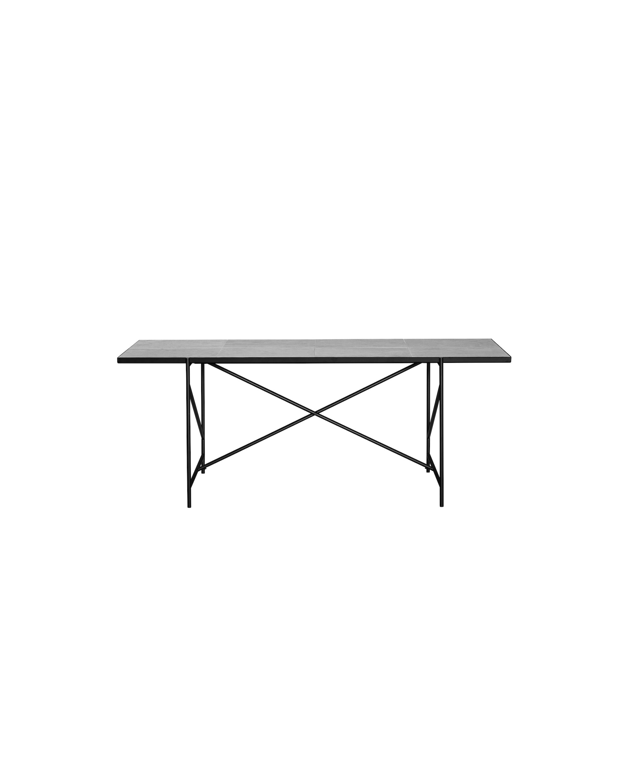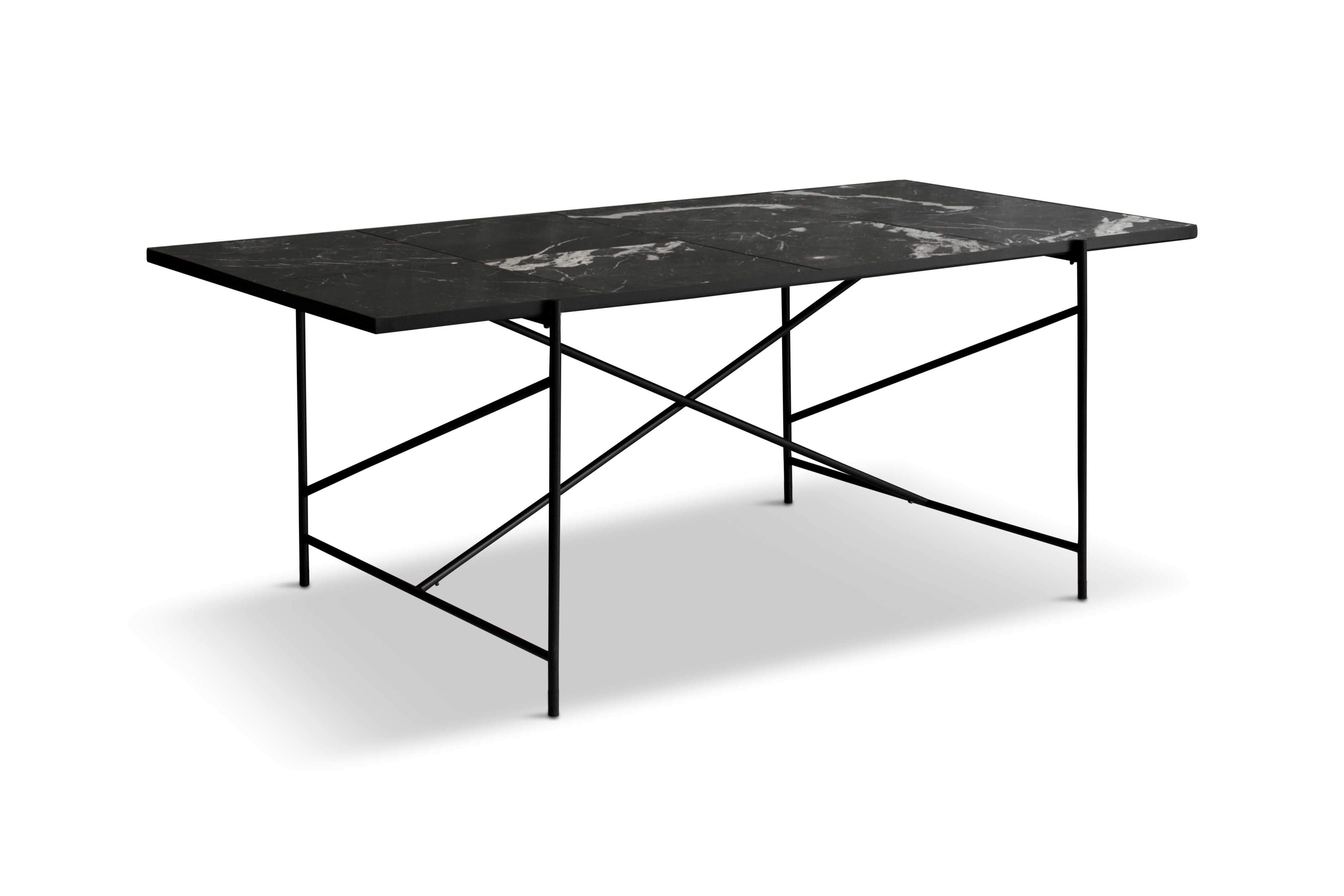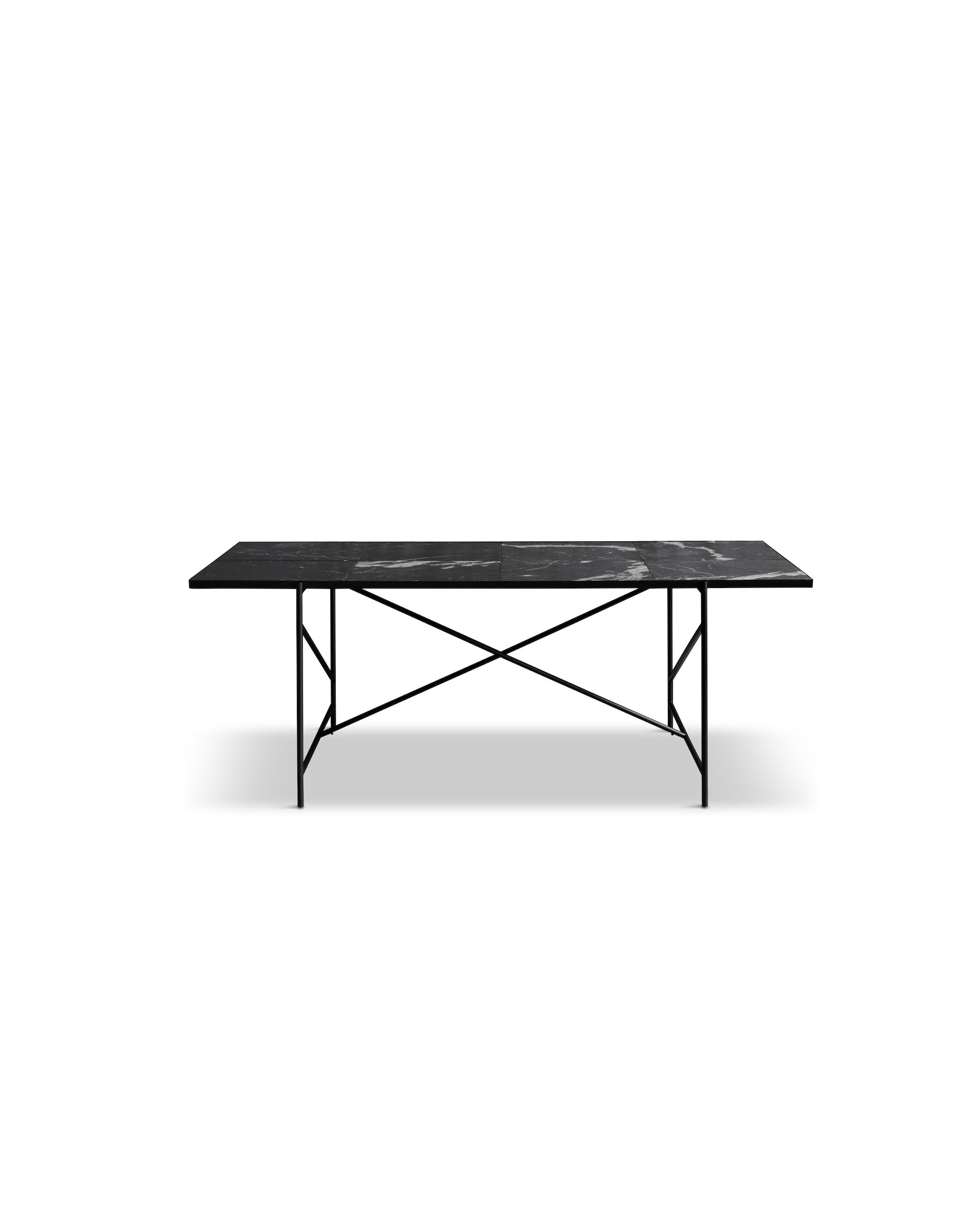 A black powder-coated frame paired with a distinctive marble top. Embrace the uniqueness of each marble tile, as natural variations create one-of-a-kind stones. For added warmth and an elegant touch, opt for solid brass details.