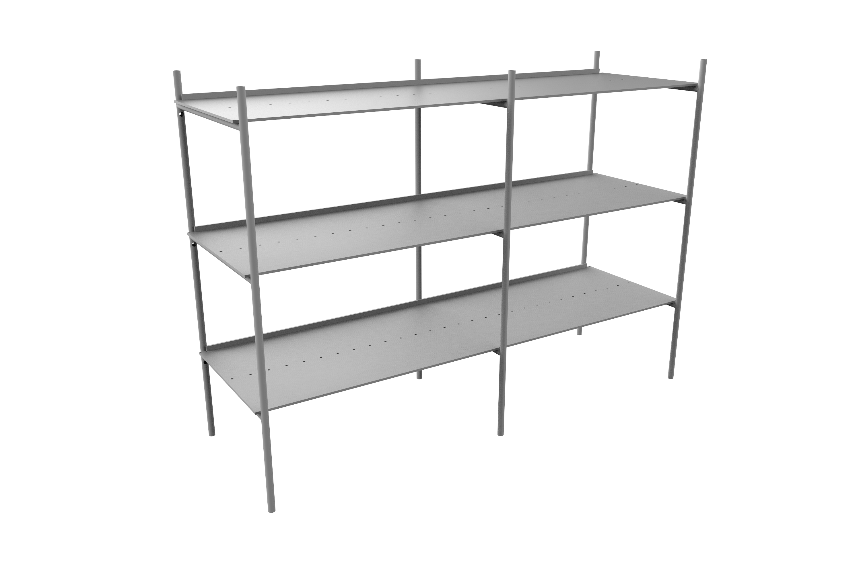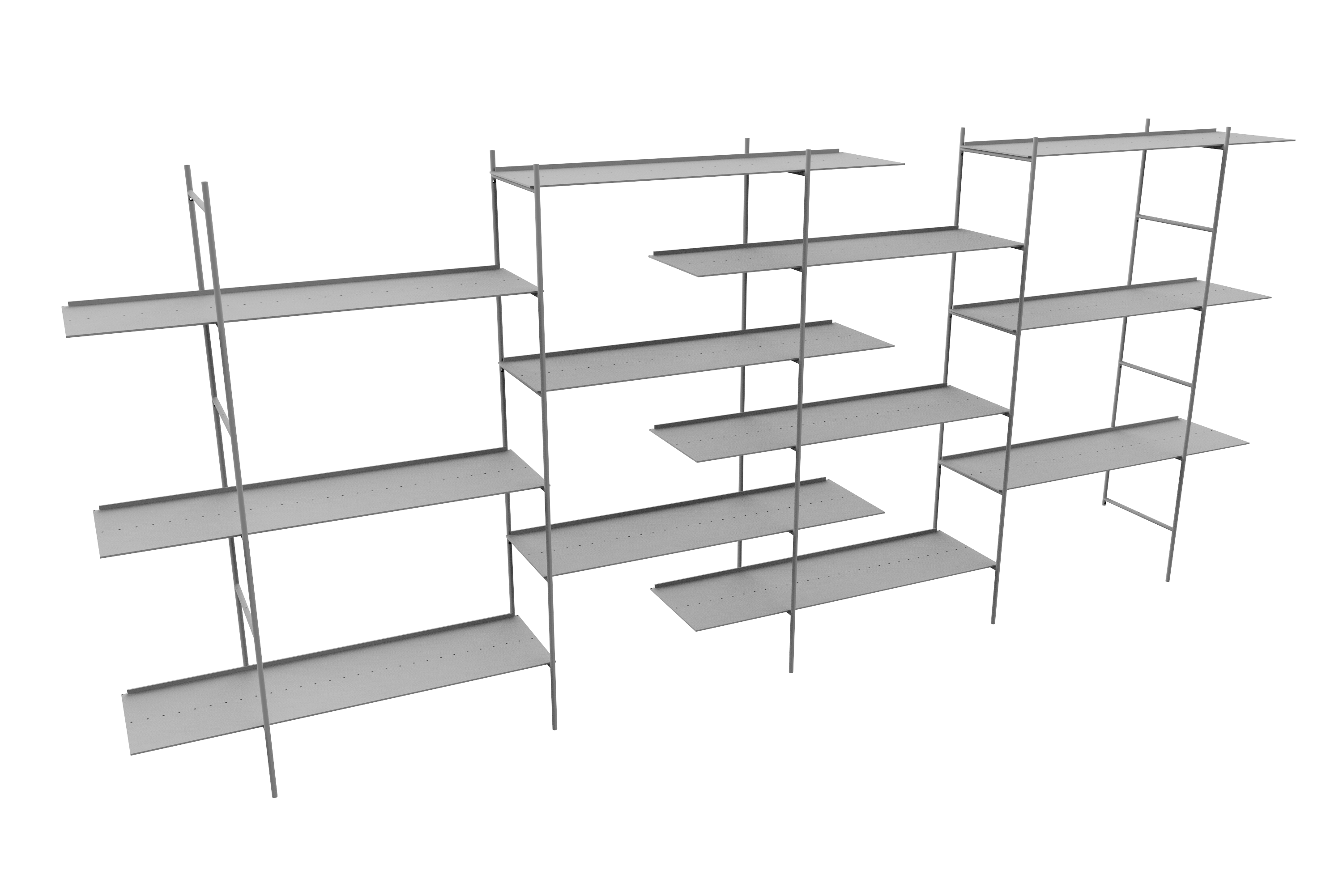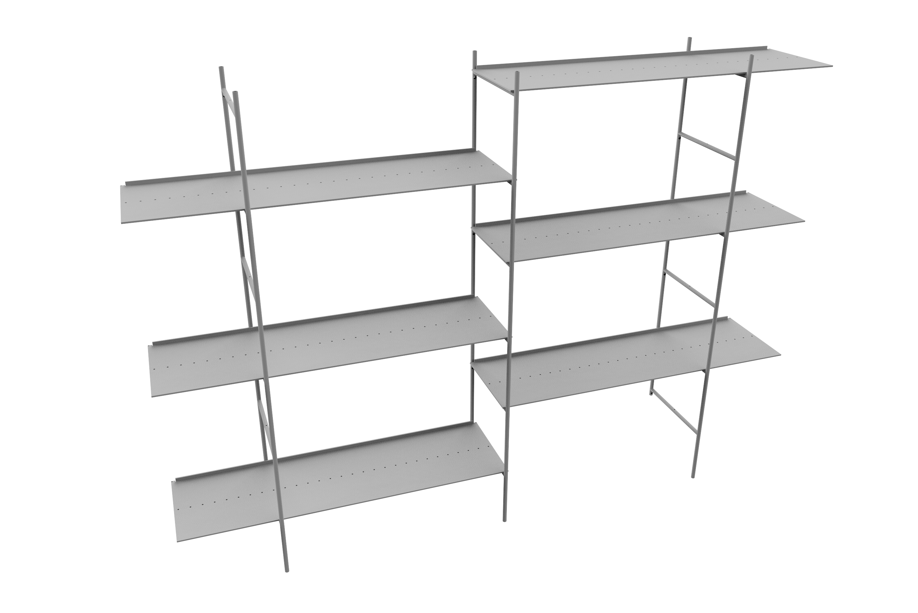 A powder-coated steel frame with bent steel shelves. The shelf design incorporates holes, enabling easy customization by shifting shelves from left to right before securing them to the ladders.