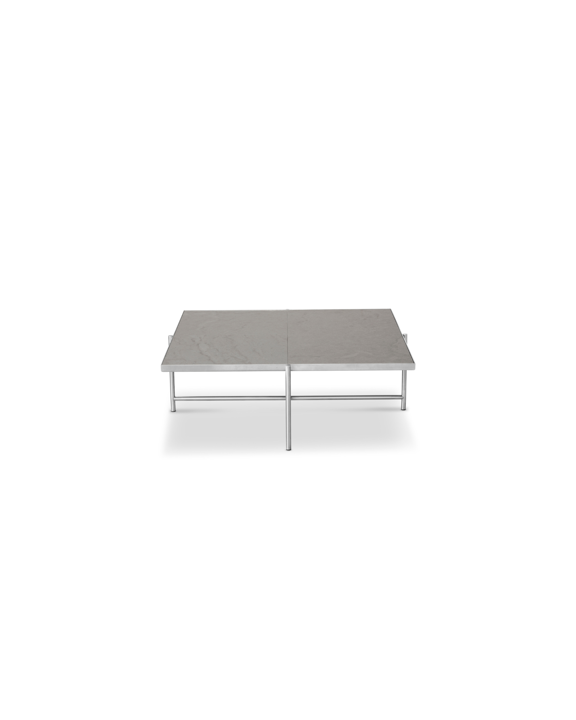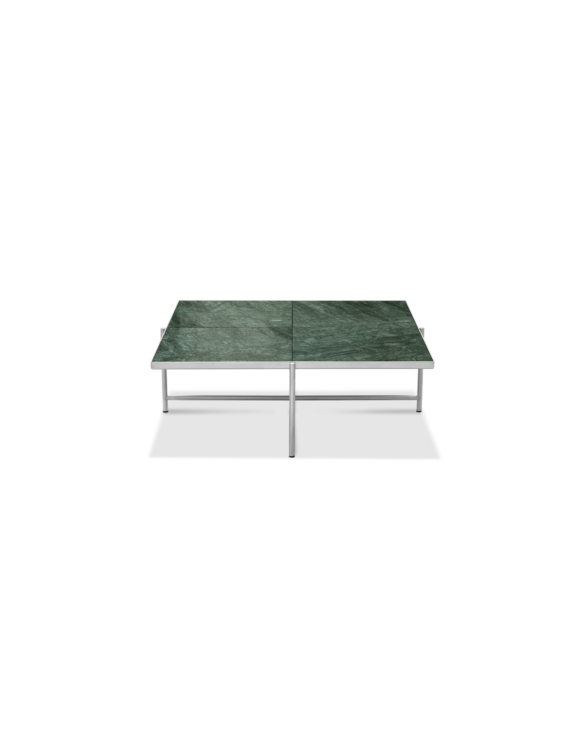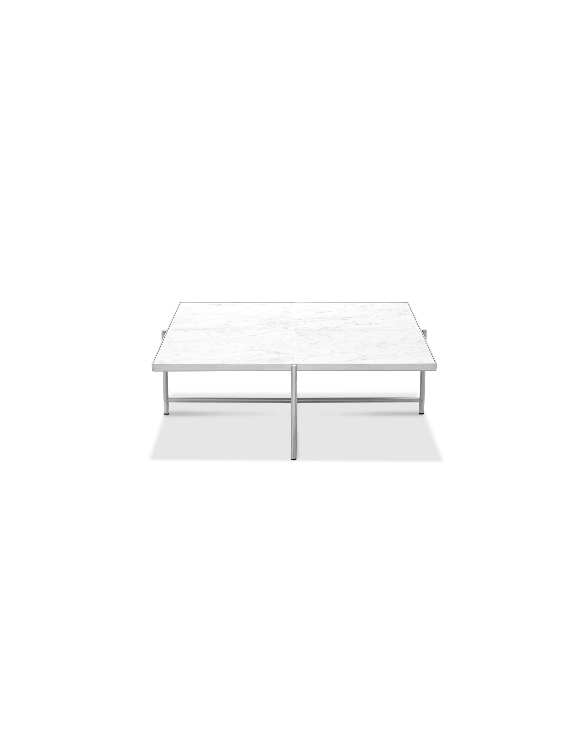 This large and low coffee table is an ultra-modern interpretation of the classic tile top design. Featuring four pieces of marble mounted in a slender metal frame, this table stands as a timeless and sophisticated piece.