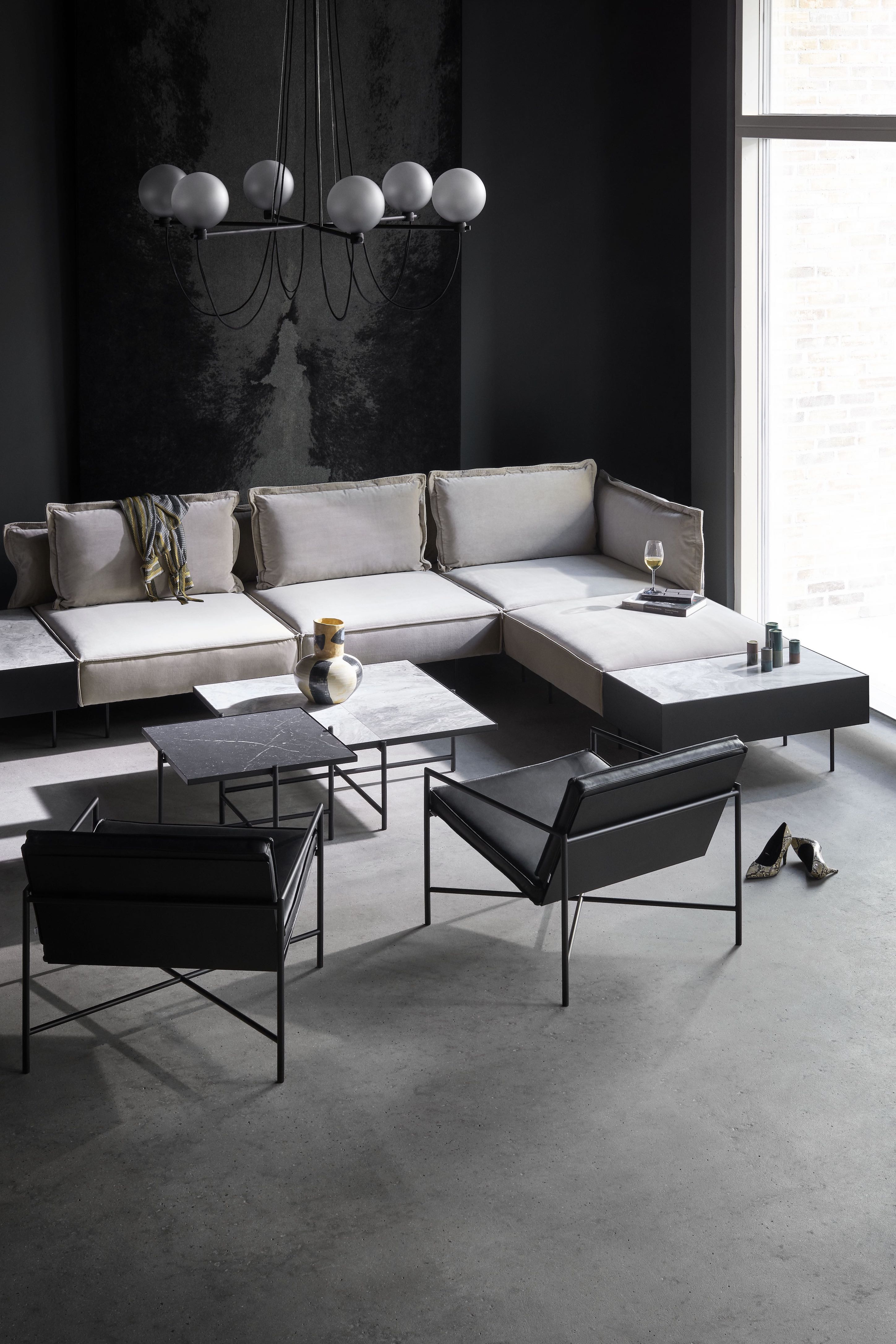 Made like building blocks, the Modular Sofa offers infinite combinations in your desired upholstery. Freely add or remove armrests, backrests, modules, or chaise longs for the perfect fit. Combine products or complement them with the Accent Table as an offset coffee table, flush in height with the modules.