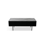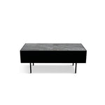 A black wooden frame with steel legs paired with a distinctive marble top. Embrace the uniqueness of each marble tile, as natural variations create one-of-a-kind stones.