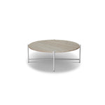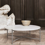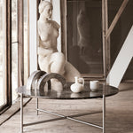 The Round Coffee Table 90 — a chic and versatile centerpiece — is the first round table in HANDVÄRK's collection. The organic shape exudes a soft, feminine feel, while the sturdy steel frame balances the design, infusing an androgynous touch that adds a modern edge. The complete marble tile top adds a touch of luxury, creating a sophisticated focal point and elevating your living space with this harmonious blend of elegance and strength, featuring softer shapes and robust materials.